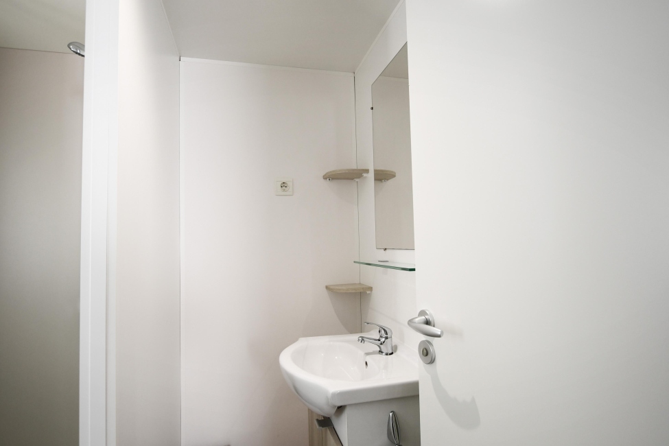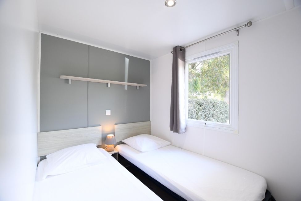 Dieses 29 m² große Mobilheim ist ideal für 4 Personen und besteht aus vier Räumen: Esszimmer mit voll ausgestatteter Küche, Badezimmer und zwei Schlafzimmern (ein Elternschlafzimmer mit einem Doppelbett und ein zweites mit zwei Einzelbetten). Das Mobilheim Alga verfügt über eine integrierte Terrasse. Es ist außerdem mit einem Fernseher und einer Klimaanlage ausgestattet.